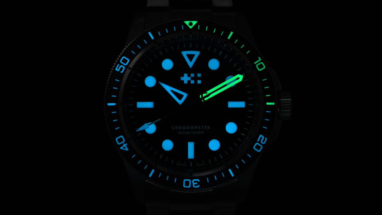 Um dos principais destaques é o uso do material luminoso Globolight®, aplicado nos índices circulares e nos ponteiros. O ponteiro de minutos, em cerâmica luminosa, emite brilho verde, enquanto os ponteiros de horas e segundos aparecem em azul.