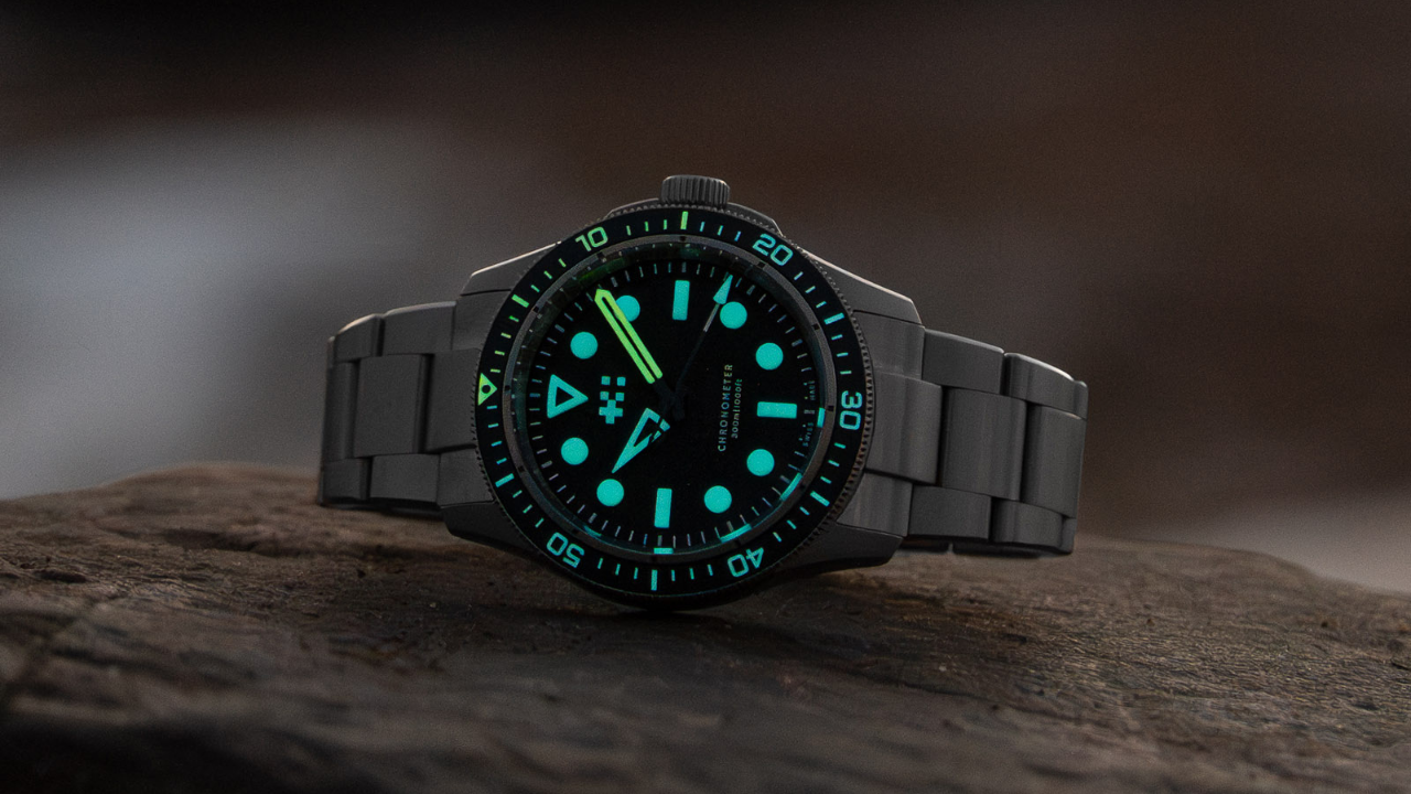 O Green Fifteen utiliza um mostrador preto com textura granular suave, reforçando a proposta de relógio ferramenta. O anel interno elevado com escala de minutos aumenta a profundidade visual e a legibilidade.