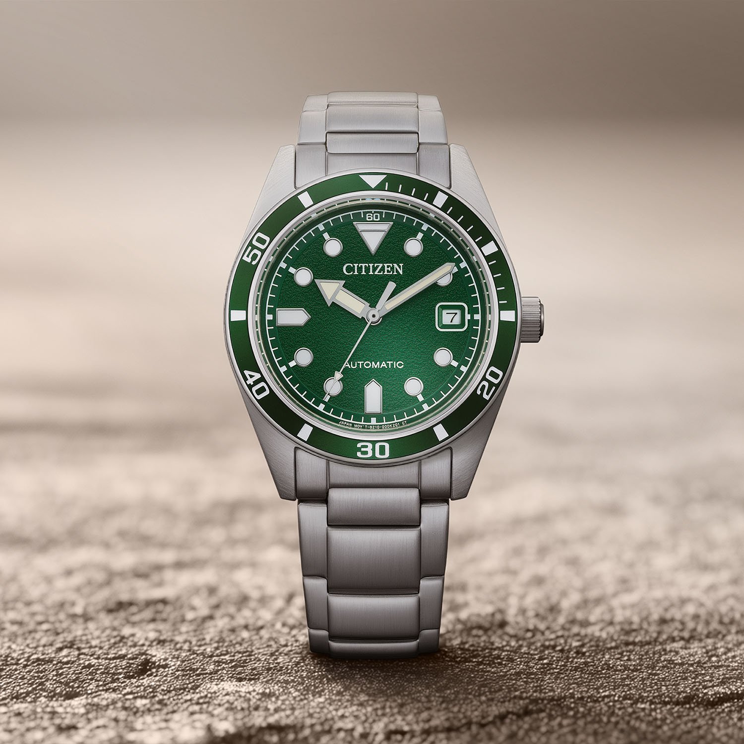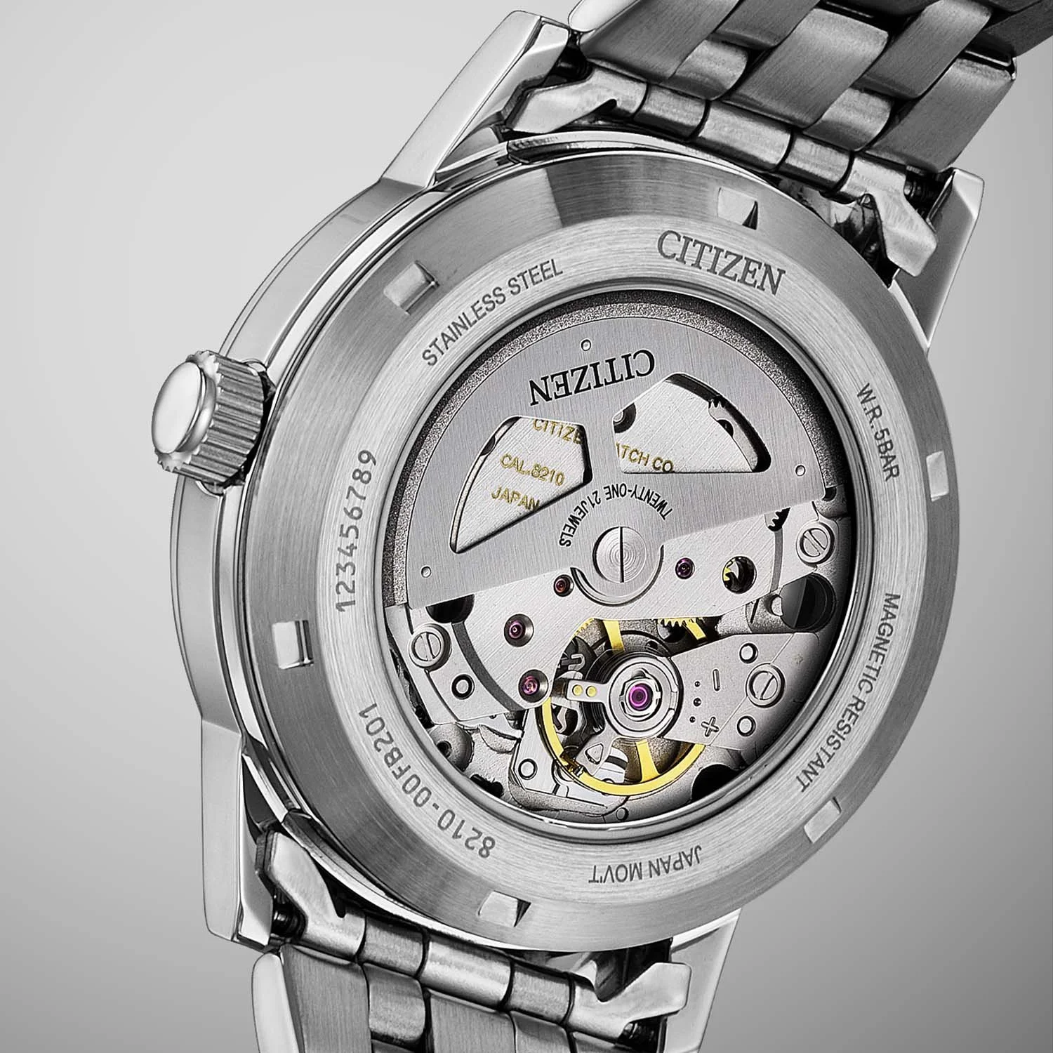 Tanto a série NJ0210 Dress quanto a NJ022 Diver-Style são equipadas com o calibre automático Citizen 8210, um movimento conhecido pela confiabilidade e simplicidade construtiva. Operando a 21.600 alternâncias por hora (3 Hz), o mecanismo oferece cerca de 40 horas de reserva de marcha, além de função de data.