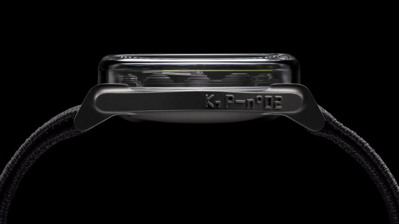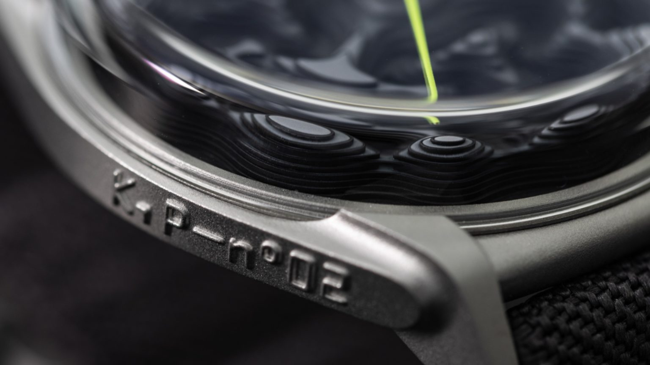A caixa é produzida em aço 316L por die-casting, processo escolhido pela capacidade de gerar formas e texturas inviáveis pela fresagem convencional. É uma peça única, sem bisel separado, com lugues triangulares integrados e curvados para baixo, coroa estilo válvula e a designação "K,P–n°02" em relevo no flanco. Com 39,5 mm de diâmetro, a caixa em si tem apenas 5,90 mm de espessura. Os 12,40 mm totais vêm principalmente do cristal. O conjunto é leve no pulso, mais próximo do titânio do que do aço convencional, efeito que a pulseira têxtil elástica em antracite contribui para reforçar.