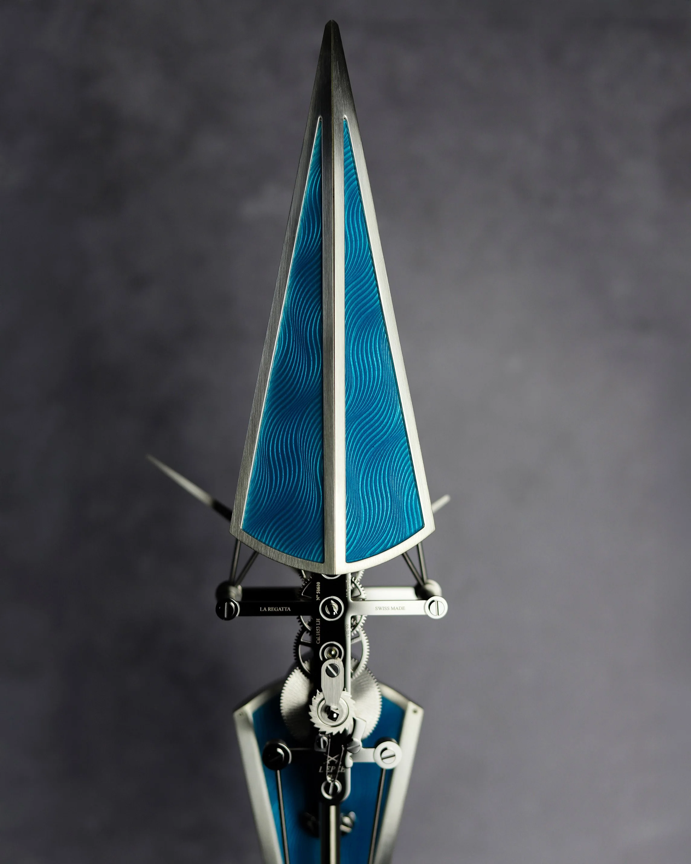 Internamente, o La Regatta revela toda a sua arquitetura mecânica disposta em um único eixo vertical. O tambor e o escapamento posicionados em extremidades opostas criam um equilíbrio visual que ecoa a postura e a harmonia de uma equipe de remo em sincronia.