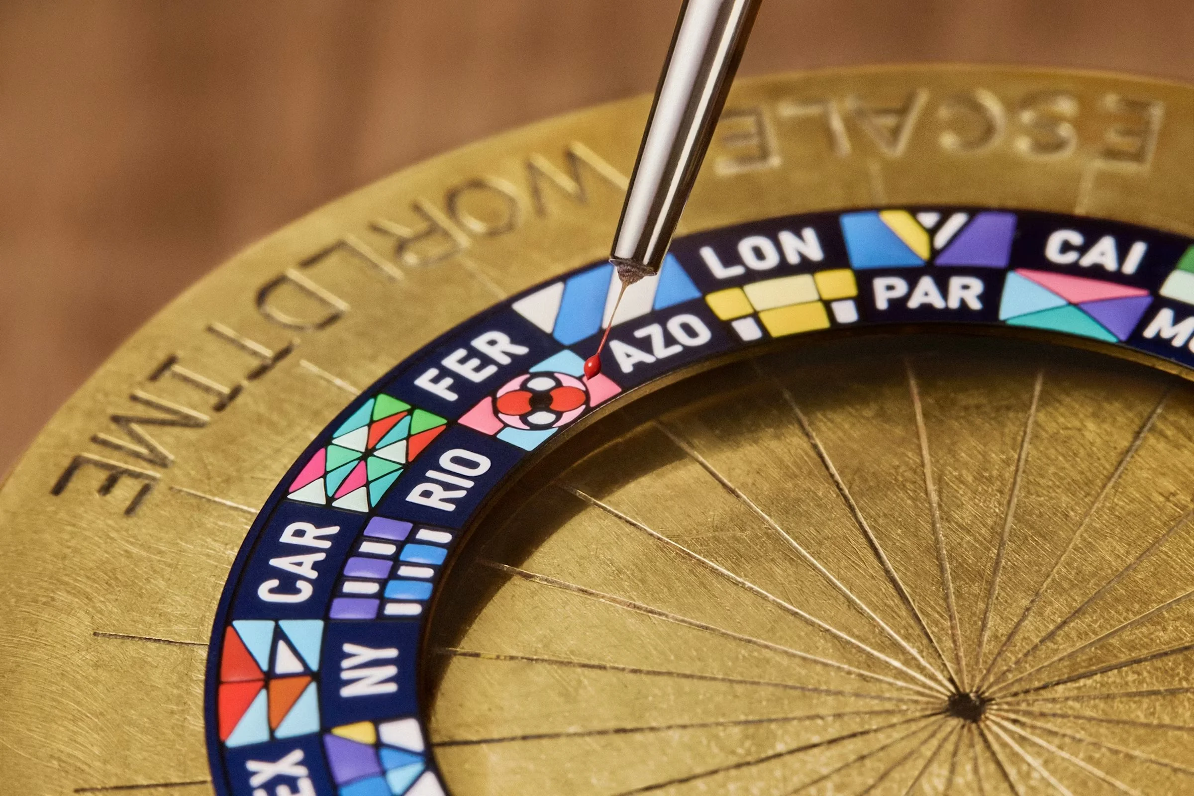 Os detalhes do mostrador incluem pinturas em miniatura feitas à mão que representam cidades em torno do mundo, reforçando o tema de viagem e a identidade histórica da marca.
