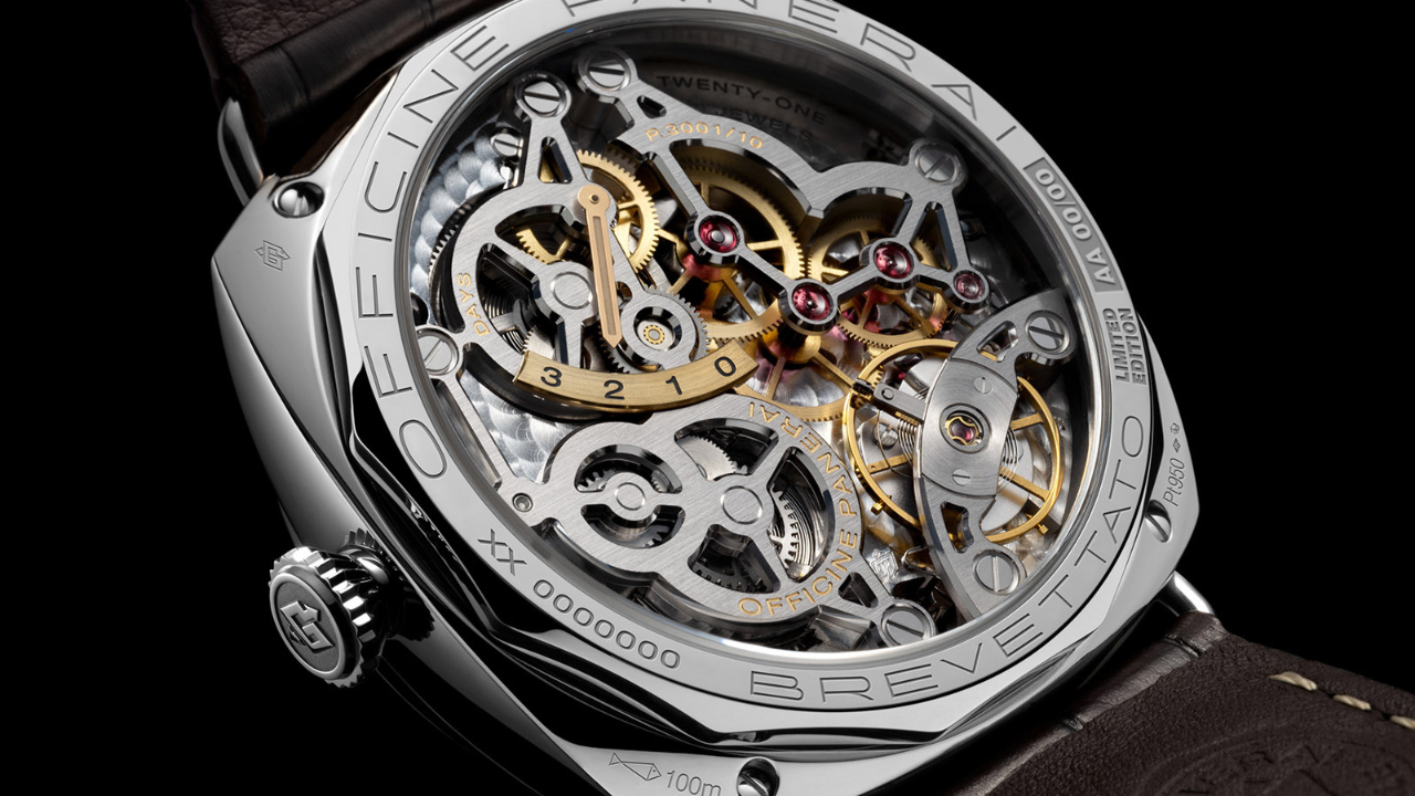 A combinação entre bronze e platina simboliza a evolução histórica da Panerai, de fornecedora militar para marca de luxo contemporânea.