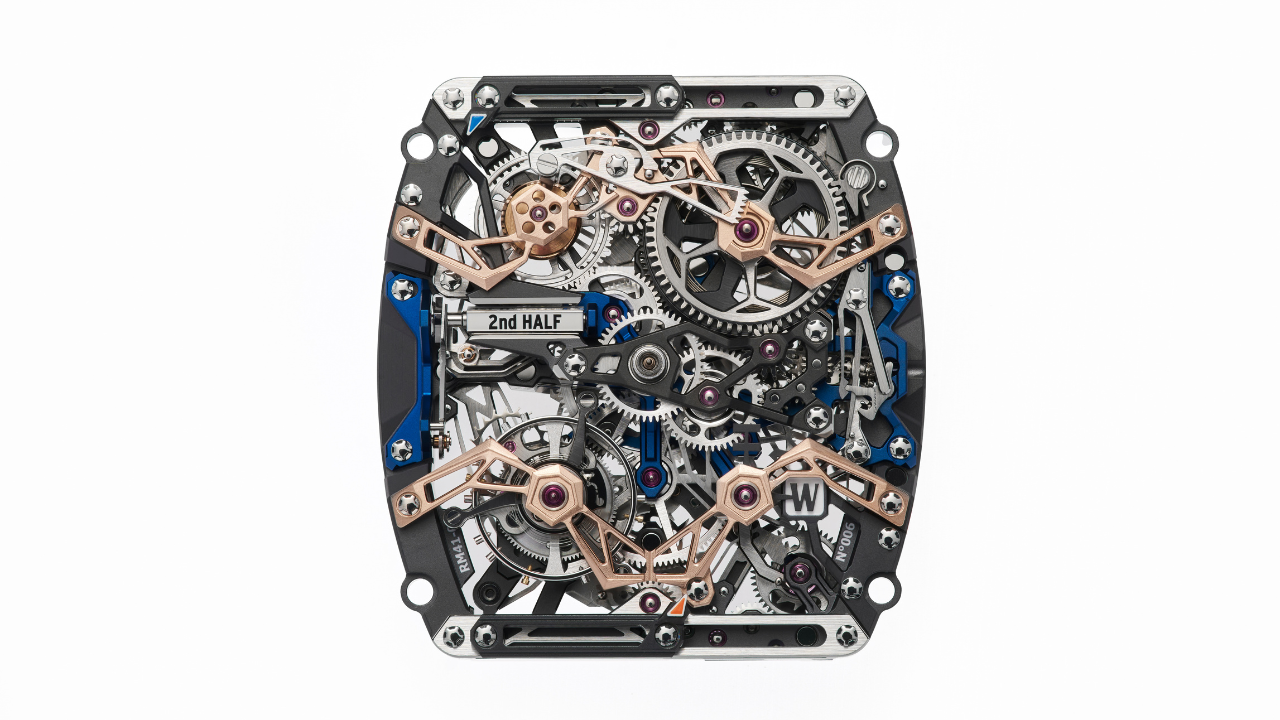 A filosofia de esqueletização da Richard Mille atinge aqui um nível extremo. Pontes, engrenagens e alavancas são reduzidas ao mínimo necessário, revelando a estrutura tridimensional do calibre.