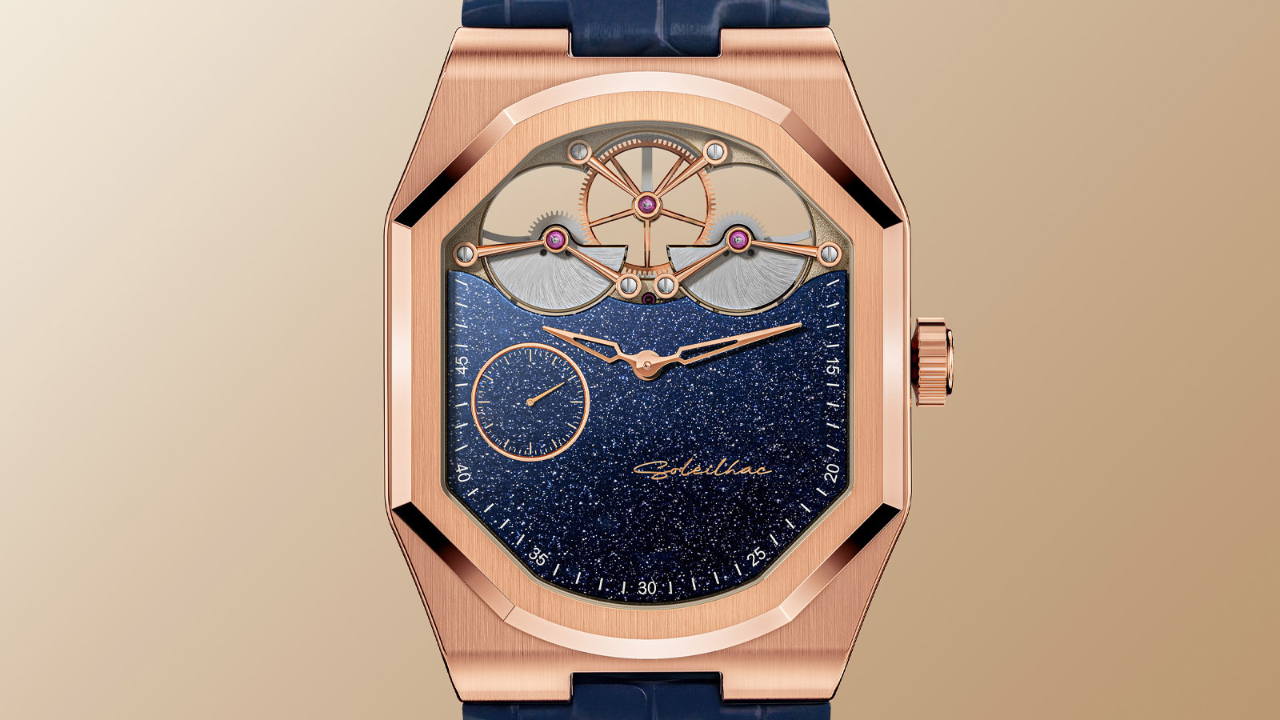 O relógio é oferecido em titânio grau 5 ou ouro rosé, com mostradores em tons areia ou aventurina, esta última conferindo profundidade visual e caráter mais decorativo ao modelo.