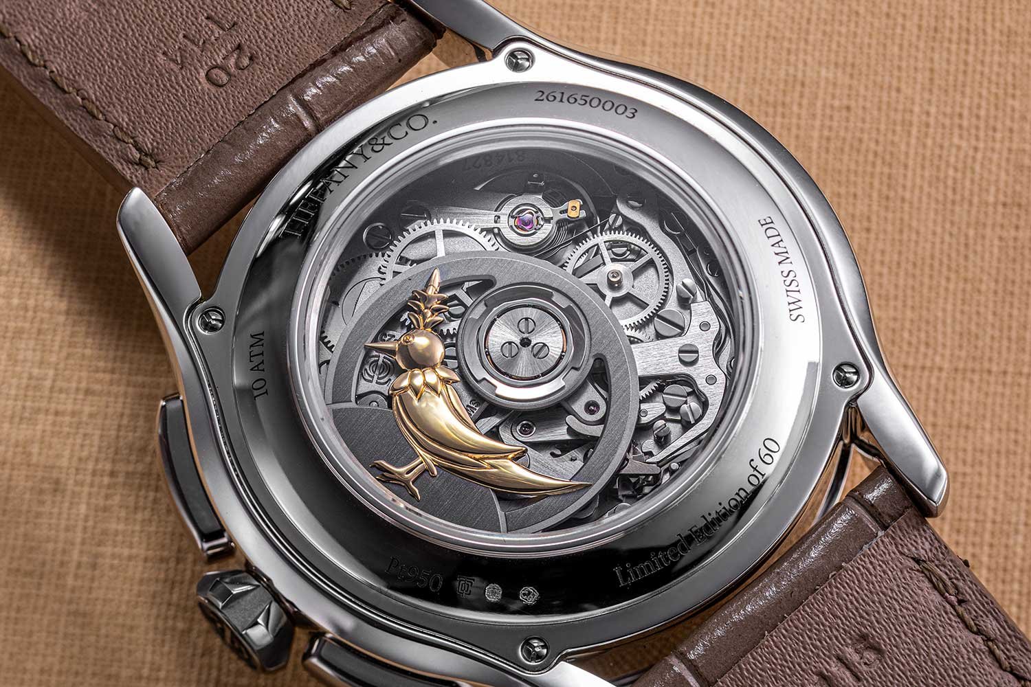 O peso visual mais marcante do calibre personalizado é o motivo “Bird on a Rock” em ouro 18K no rotor, inspirado na obra icônica de Jean Schlumberger, um dos grandes nomes da história da Tiffany.
