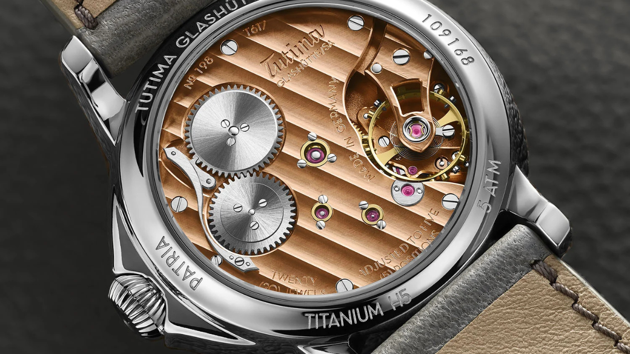 O logotipo histórico da Tutima aparece no subdial, reforçando a ligação com a herança da marca em Glashütte.